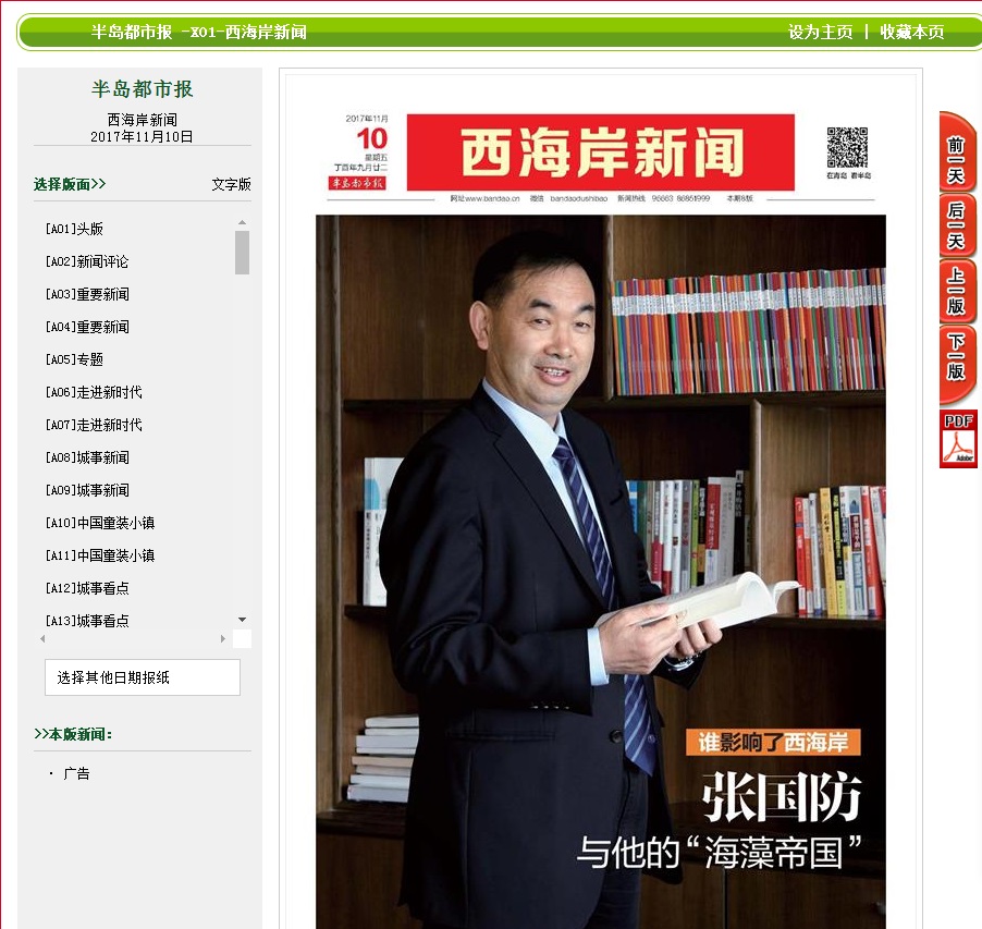 明月海藻集團(tuán)董事長(zhǎng)張國(guó)防接受《青島日?qǐng)?bào)》等媒體采訪