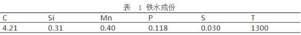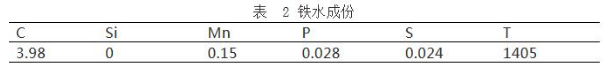 前期渣中加入石灰3 噸,輕燒 3 噸,冷料 3.5 噸,在吹煉到 1800 氧后起槍倒渣,此時的轉(zhuǎn)爐內(nèi)鐵水溫度為 1405 度,成份如下表: