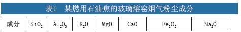 玻璃熔窯排放煙氣的粉塵有以下幾個特點:① 濃度低(1 0 0~8 0 0 m g / N m 3):燃用天然氣時,粉塵主要來源于原料的高溫分解產(chǎn)物,濃度一般低于200mg/Nm3;燃燒石油焦時,除原料分解外,粉塵還來源于石油焦中的灰分,但濃度一般也不超過800mg/Nm3。②粒徑小(<2μm,平均粒徑0.7μm)、表面能大、黏附性強。③成分復(fù)雜,以Na2SO4 鹽為主,燃用石油焦時,還含有V2O5等催化成分,表1為某燃用石油焦的玻璃熔窯煙氣粉塵成分檢測數(shù)據(jù)。