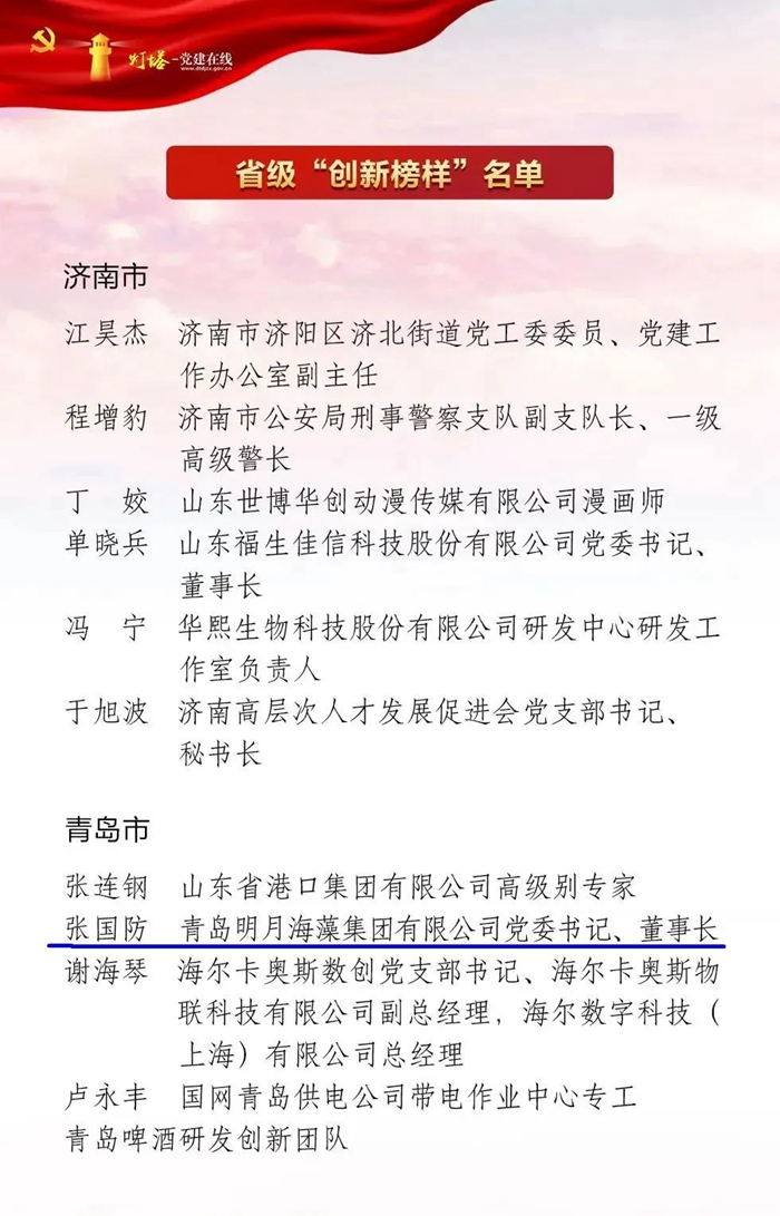 11月24日,省委組織部公布山東省創(chuàng)新榜樣名單,青島明月海藻集團(tuán)黨委書(shū)記、董事局主席張國(guó)防光榮上榜。