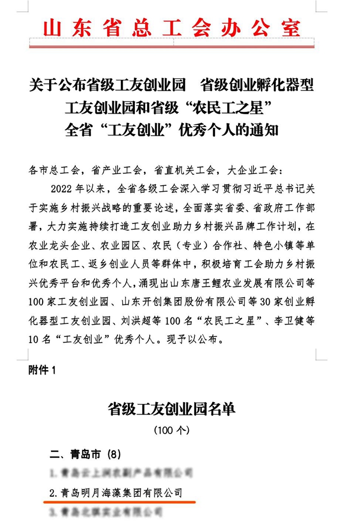 近日,山東省總工會下發(fā)《關于公布省級工友創(chuàng)業(yè)園、省級創(chuàng)業(yè)孵化器型工友創(chuàng)業(yè)園、省級“農民工之星”和全省“工友創(chuàng)業(yè)”優(yōu)秀個人的通知》,青島明月海藻集團成功入選省級工友創(chuàng)業(yè)園。