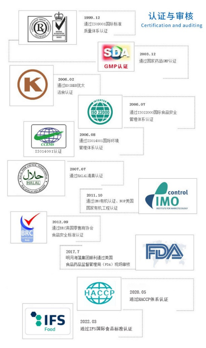 質(zhì)量是企業(yè)的立身之本、發(fā)展之基、信譽(yù)之源。企業(yè)改制25年以來,明月海藻集團(tuán)始終堅(jiān)持“堅(jiān)持質(zhì)量至上,滿足顧客期望,確保技術(shù)優(yōu)勢(shì),領(lǐng)先市場(chǎng)競(jìng)爭(zhēng)”的質(zhì)量方針,建立了一套科學(xué)化、數(shù)字化、網(wǎng)格化的全員質(zhì)量管理體系。公司擁有“青島市首席質(zhì)量官”,擁有高水平的產(chǎn)品質(zhì)量檢測(cè)中心,并通過了ISO9001、ISO22000、ISO14001、BRC、GMP、KOSHER、HALAL等系列認(rèn)證。