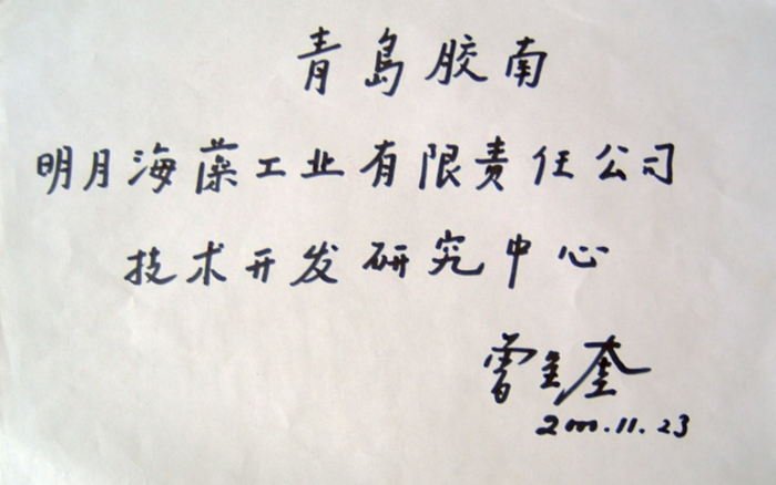曾呈奎題寫“青島膠南明月海藻工業(yè)有限公司技術(shù)開發(fā)研究中心”