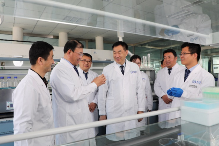 青島明月海藻集團董事長張國防(中)在國重實驗室交流產(chǎn)品研發(fā)工作