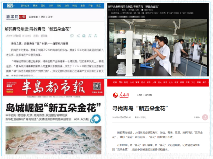 品牌成就城市,城市造就品牌。2016年8月,新華社“解碼青島”專題調(diào)研組抵青,圍繞“青島制造”的主題開展了集中調(diào)研,以“青島制造”為樣本,探尋中國制造之路。調(diào)研組先后到海爾、海信、青啤、雙星、澳柯瑪、明月海藻等22家知名企業(yè)進(jìn)行實(shí)地調(diào)研采訪。新華社在調(diào)研之后,陸續(xù)推出了一系列“尋找青島‘新五朵金花’”的報道,其中,青島明月海藻集團(tuán)因其鮮明的海洋品牌特色,被譽(yù)為青島“新五朵金花”之“海洋之花”。
