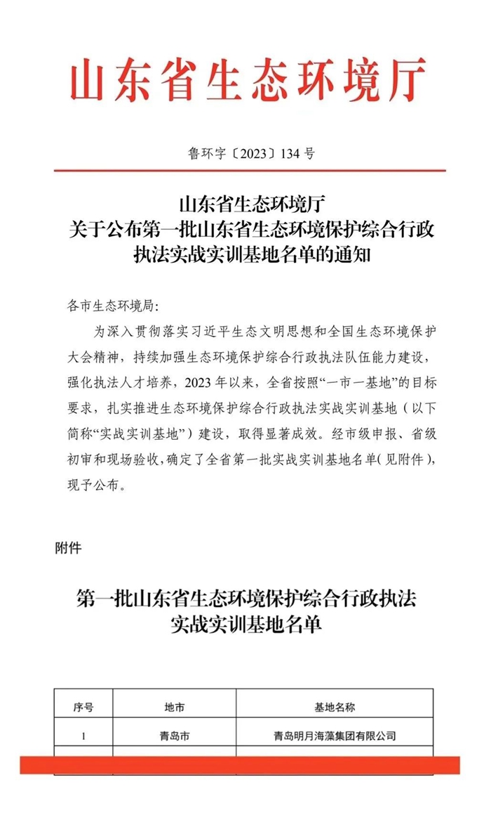 日前,青島明月海藻集團(tuán)被山東省生態(tài)環(huán)境廳授予“首批山東省生態(tài)環(huán)境保護(hù)綜合行政執(zhí)法實(shí)戰(zhàn)實(shí)訓(xùn)基地”。