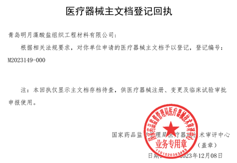 截至目前已有313家企業(yè)在器審中心進行了主文檔登記,我公司為首家藻酸鹽類醫(yī)療器械原料主文檔登記企業(yè)。主文檔登記公示后,使醫(yī)療器械生產(chǎn)企業(yè)能方便的獲悉我公司的生產(chǎn)能力,擴大了在醫(yī)療器械原料領域的影響力。