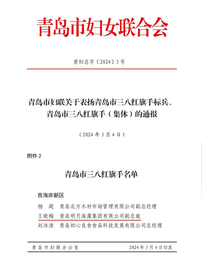 近日,青島市婦女聯(lián)合會(huì)發(fā)布《關(guān)于表?yè)P(yáng)青島市三八紅旗手標(biāo)兵、青島市三八紅旗手(集體)的通報(bào)》,其中,青島明月海藻集團(tuán)有限公司副總裁王曉梅同志獲評(píng)青島市三八紅旗手榮譽(yù)稱號(hào)。