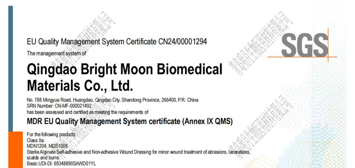 明月生物醫(yī)用材料獲得SGS頒發(fā)的歐盟MDR證書(shū)