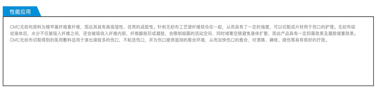 CMC無紡布是將羧甲基纖維素纖維以非織造工藝制備得到的無紡布產(chǎn)品。非織造布產(chǎn)品柔軟疏松,同時又具有一定強度。CMC無紡布經(jīng)后續(xù)分切可以制作成各種尺寸規(guī)格的敷料片材用于傷口護理。公司具有小批量研發(fā)及大規(guī)模生產(chǎn)所需要的各種設(shè)備,可根據(jù)客戶要求生產(chǎn)多種克重和寬幅的卷材,并可根據(jù)需要切割成任意規(guī)格的片材。