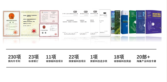 明月海藻集團獲得國內(nèi)外專利 230 項,主持和參與制訂各類行業(yè)、國家標準 23 項,承擔省部級科技項目 11 項,國家級科技項目 22 項;獲國家科技進步獎 1 項,省部級科技獎勵 18項;出版海藻產(chǎn)業(yè)科技專著 20 余部。